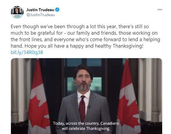 وكتب جاستين ترودو تغريدة على تويتر قال فيها: "على الرغم من أننا مررنا بالكثير هذا العام، فلا يزال هناك الكثير مما يجب أن نكون ممتنين له- عائلتنا وأصدقائنا، والذين يعملون في الخطوط الأمامية، وكل من يتقدم لتقديم يد المساعدة. أتمنى لكم جميعًا عيد شكر سعيدًا وصحيًا".