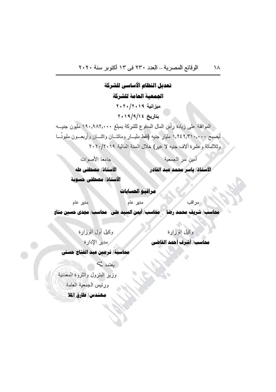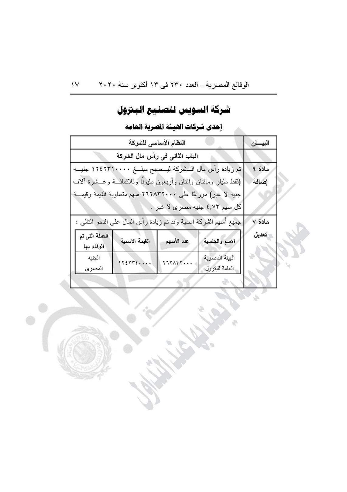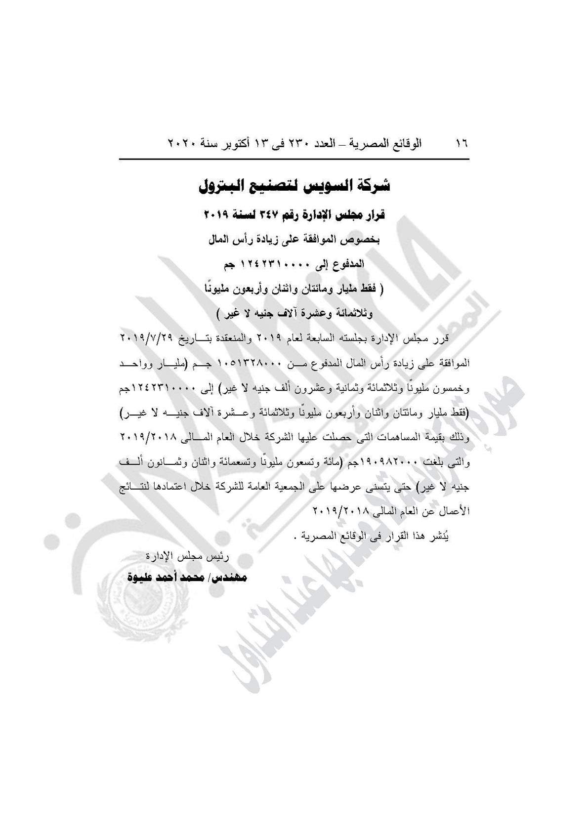 نشرت جريدة الوقائع المصرية في عددها رقم230، الصادر في 13 أكتوبر 2020، قرار شركة السويس لتصنيع البترول رقم 347 لسنة 2019، بالموافقة على زيادة رأس المال المدفوع إلى مليار و242 مليون و310 ألف جنيه.