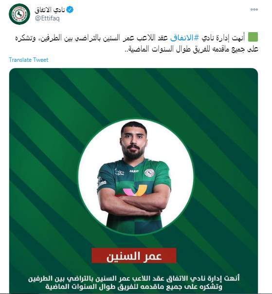 وكتب نادي الاتفاق تغريدة على تويتر "أنهت إدارة نادي #الاتفاق عقد اللاعب عمر السنين بالتراضي بين الطرفين، وتشكره على جميع ماقدمه للفريق طوال السنوات الماضية.."