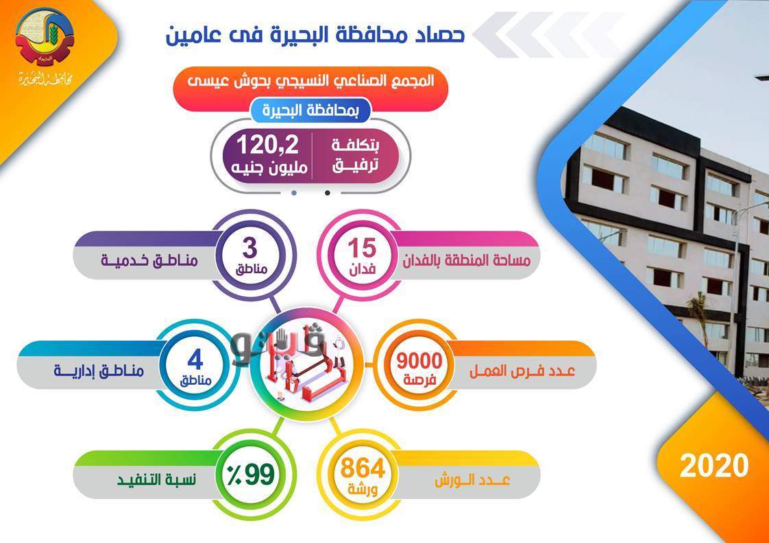 وأوضح الٱنفوجراف أن تكلفة ترفيق مشروع المجمع الصناعي النسيجي بحوش عيسى تجاوزت 120 مليون جنيه و مقام علي مساحة 15 فدان و يتكون من 3 مناطق خدمية و 4 مناطق إدارية و 864 ورشة ويوفر 9000 فرصة عمل وتصل نسبة تنفيذ بالمشروع 99%.