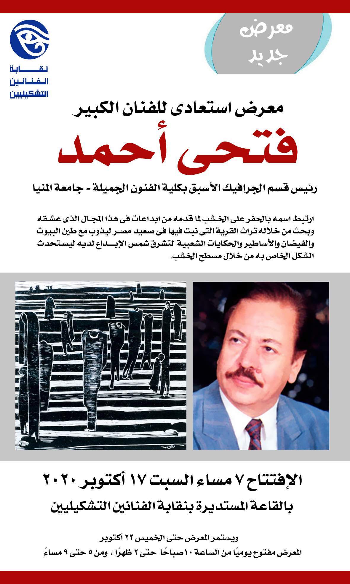 يأتي ذلك في تمام الساعة السابعة من مساء يوم السبت المقبل، وشارك بالمعرض كل من الفنان طارق عبد العزيز رئيس شعبة الجرافيك بالنقابة، والدكتورة حنان سمير عضو بشعبة الجرافيك بالنقابة، ويستمر المعرض حتى يوم الخميس 22 أكتوبر الجاري.