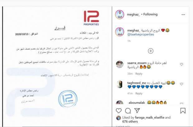 وكان أحمد الميرغني، لاعب نادي الزمالك السابق، نشر صورة من قرار اتخذه في شركته الخاصة، وذلك عبر حسابه الرسمي على موقع الصور الشهير "إنستجرام"، أنه حال تتويج النادي الأهلي بلقب دوري أبطال إفريقيا، سيتم خصم نصف شهر من جميع العاملين "الأهلاوية" بشركته، مشيرا إلى أنه في حال تتويج الزمالك باللقب الإفريقي سيتم صرف مكافآت لجميع العاملين بالشركة باستثناء "الأهلاوية".