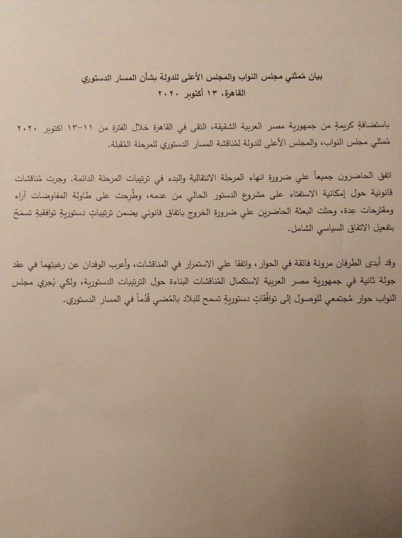 وأبدى الطرفان مرونة فائقة في الحوار، واتفقا على الاستمرار في المناقشات، وأعربا عن رغبتِهِما في عقد جولة محادثات ثانية في مصر لاستكمال المُناقشات حول الترتيبات الدستورية، ولكي يُجري مجلس النواب حوارا مُجتمعيا للوصول إلى توافُقاتٍ دستوريةٍ تسمح للبلاد بالمُضي قُدُماً في المسار الدستوري.