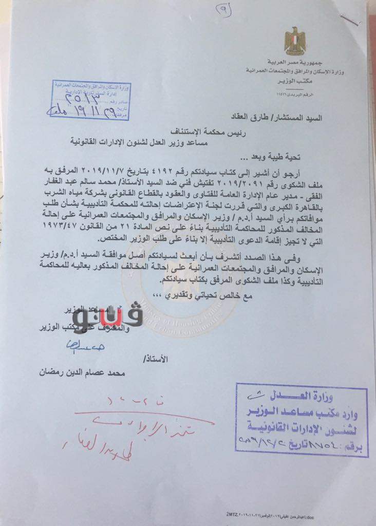 وأرفق بمذكرة وزارة الإسكان أصل موافقة الوزير على إحالة مدير عام الإدارة العامة للفتاوى والعقود بالقطاع القانوني بشركة مياة الشرب بالقاهرة الكبرى للمحاكمة، وملف الشكوى المرفق بطلب وزارة العدل.