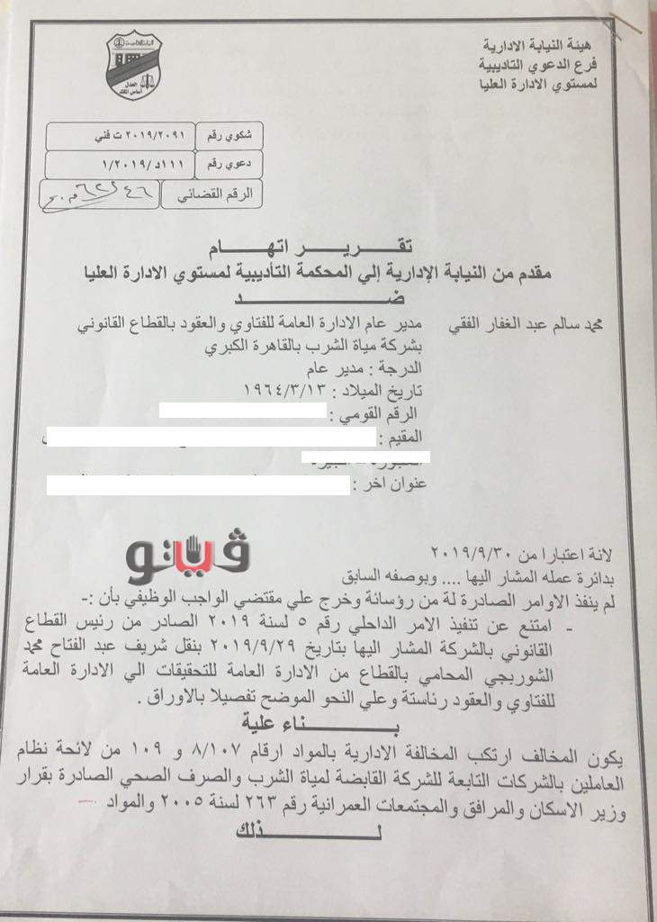 إحالة مدير عام الفتاوى والعقود بـ"مياه القاهرة" للمحاكمة العاجلة