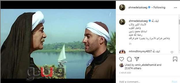 نعي الفنان أحمد السقا الفنان محمود ياسين بصورة تجمعهما من كواليس فيلم "الجزيرة" عبر صفحته الشخصية علي موقع الصور الشهير "إنستجرام".