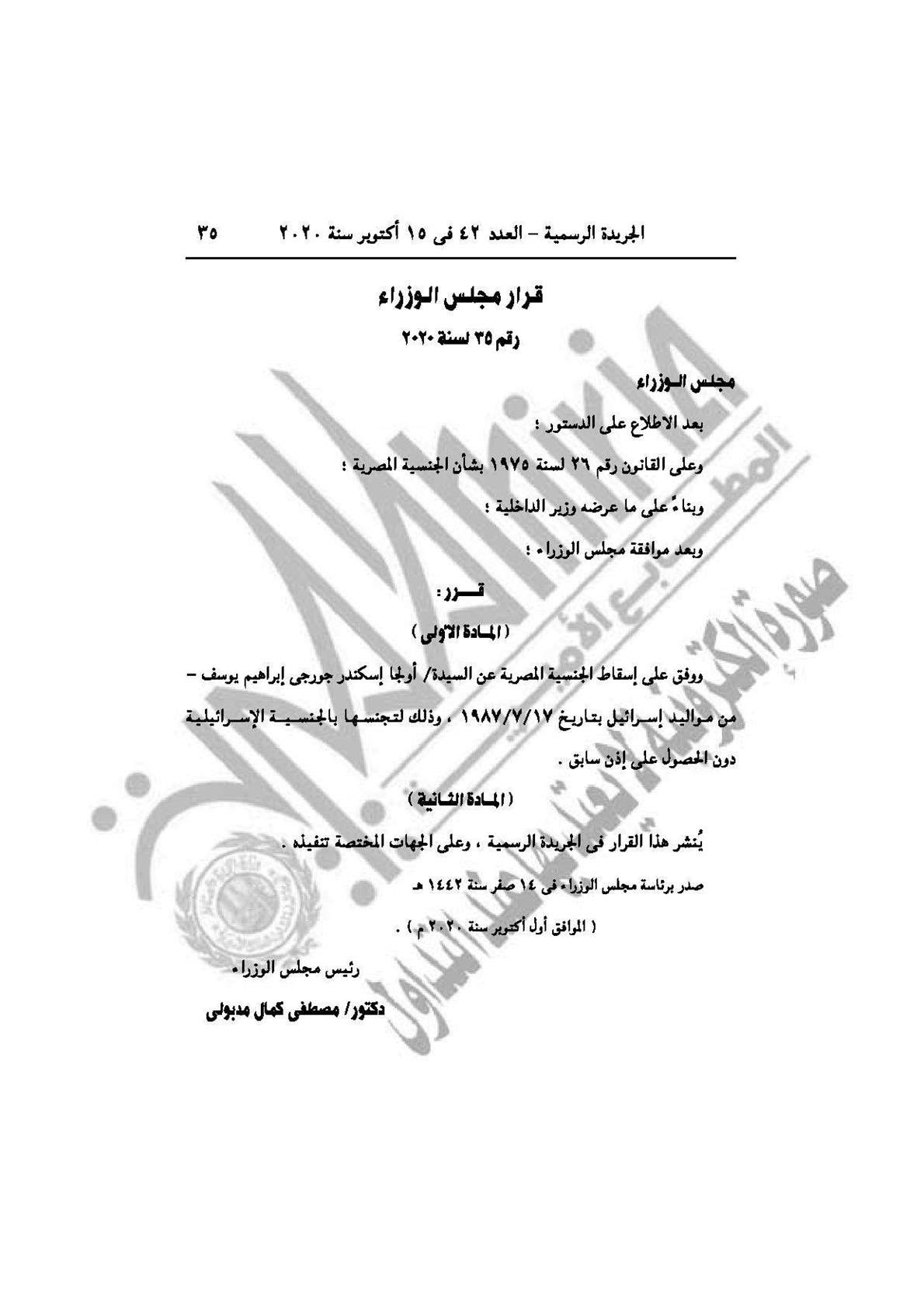 القرار رقم 35 بالموافقة على إسقاط الجنسية المصرية عن أولجا إسكندر جورجي إبراهيم يوسف، من مواليد إسرائيل بتاريخ 17/7/1987 وذلك لتجنيسها بالجنسية الإسرائيلية دون الحصول على إذن سابق.