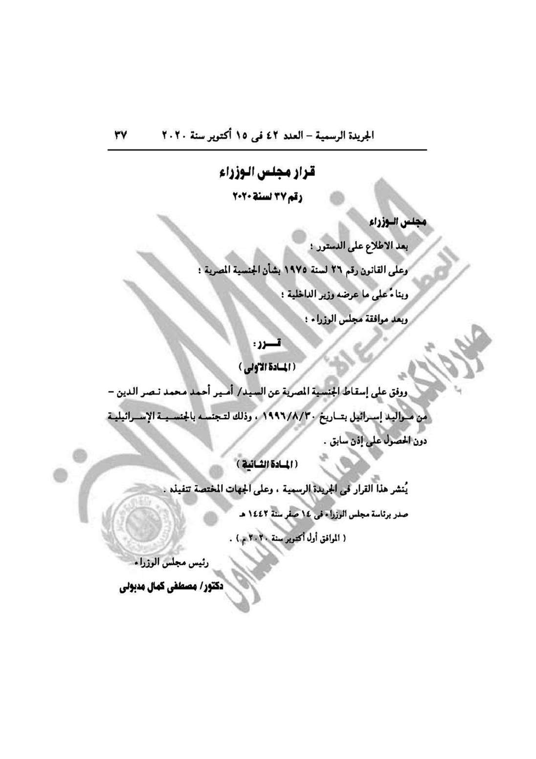 والقرار رقم 37 لسنة 2020 بالموافقة على إسقاط الجنسية المصرية عن أمير أحمد محمد نصر الدين، من مواليد إسرائيل بتاريخ 30/8/1996، وذلك لتجنيسه بالجنسية الإسرائيلية دون الحصول على إذن سابق.