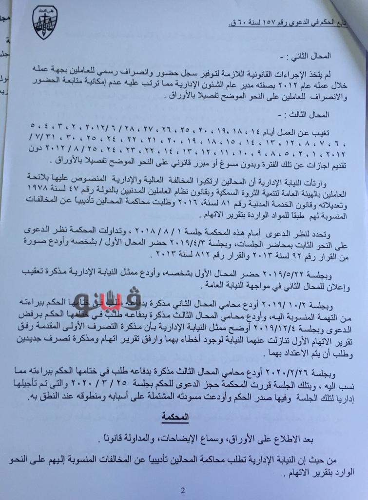 ومجازاة يوسف سيد يوسف، مدير عام الشئون الإدارية بالهيئة بغرامة تعادل الأجر الأساسي الذي كان يتقاضاه في الشهر عند انتهاء خدمته بعد ثبوت عدم قيامه باتخاذ الإجراءات اللازمة حيال توفير سجل حضور وانصراف رسمي للعاملين مما ترتب عليه عدم إمكانية متابعة الحضور والانصراف.