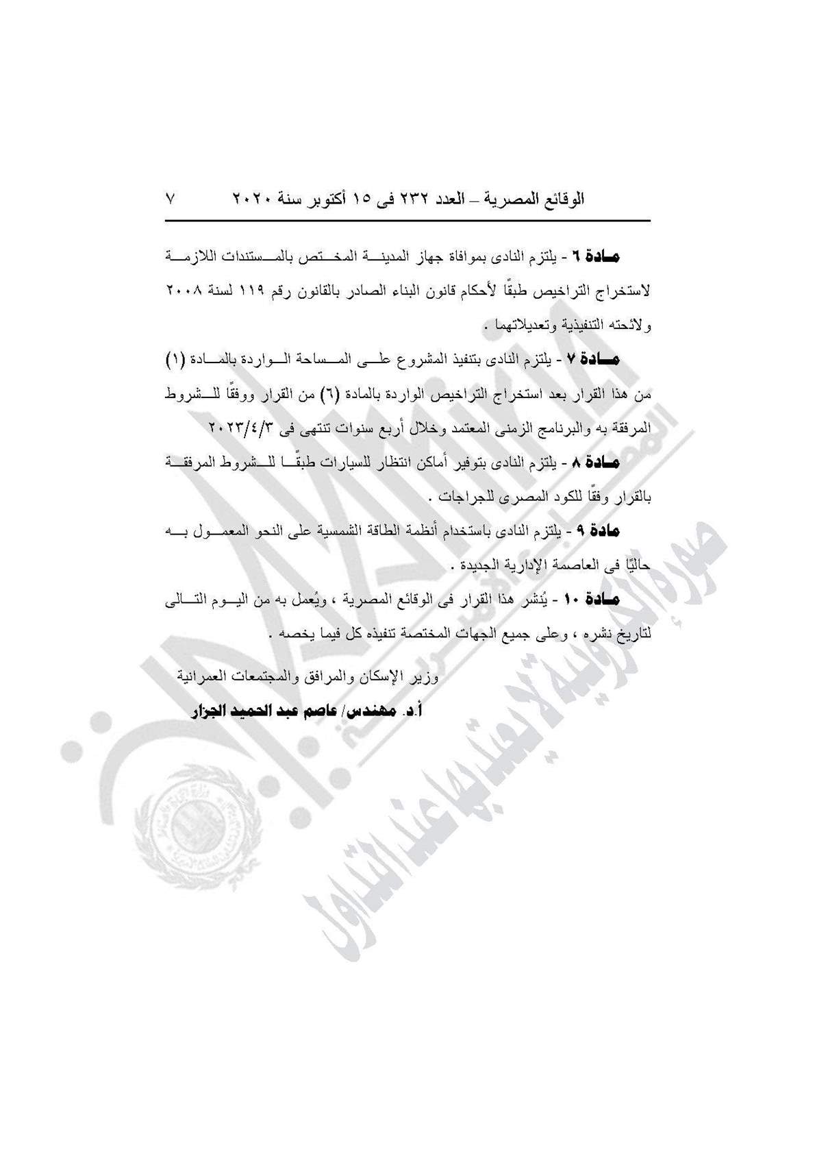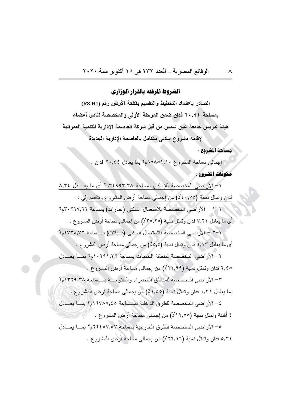 وينص القرار على اعتماد تخطيط وتقسيم قطعة الأرض رقم (R8-H1) بمساحة 20.44 فدان والمخصصة لنادي أعضاء هيئة تدريس جامعة عين شمس من قبل شركة العاصمة الإدارية للتنمية العمرانية لإقامة مشروع سكني متكامل ضمن المرحلة الأولى بالعاصمة الإدارية الجديدة.