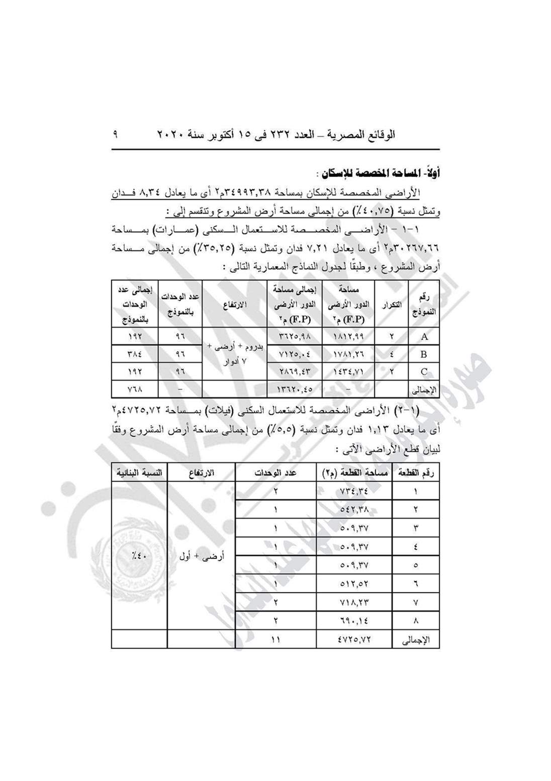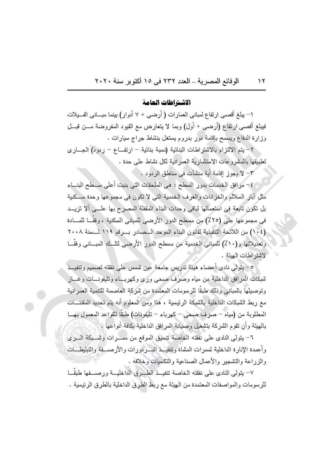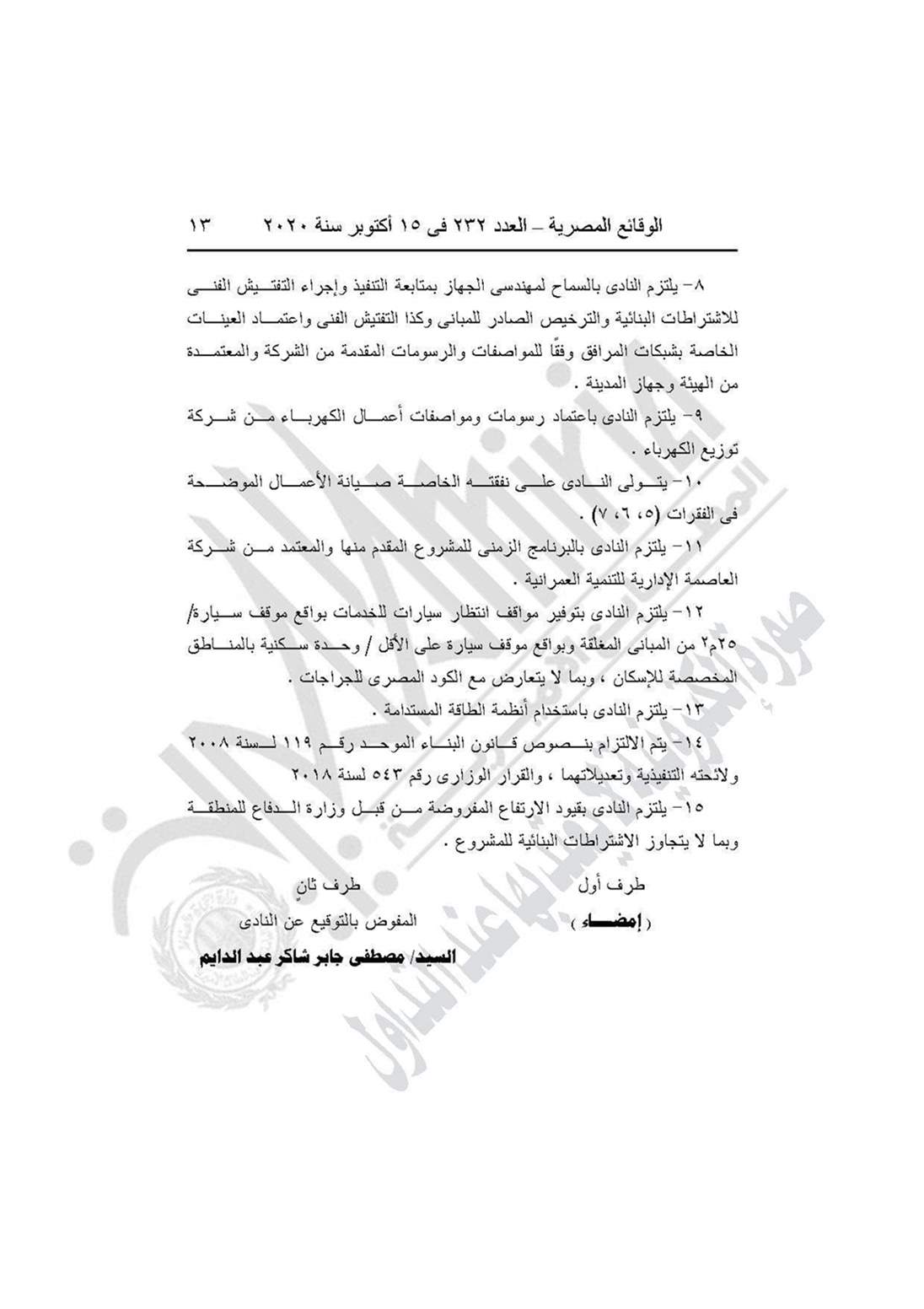 نشرت جريدة الوقائع المصرية في عددها رقم 232، الصادر في 15 أكتوبر 2020، قرار وزارة الإسكان والمرافق والمجتمعات العمرانية رقم 709 لسنة 2020، باعتماد تخطيط وتقسيم قطعة أرض بمساحة 20.44 فدان والمخصصة لنادي أعضاء هيئة تدريس جامعة عين شمس لإقامة مشروع سكني متكامل بالعاصمة الإدارية الجديدة.