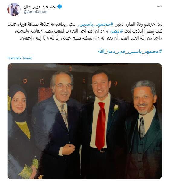 وكتب أحمد عبد العزيز قطان تغريدة على تويتر "لقد أحزنني وفاة الفنان القدير #محمود_ياسين، الذي ربطتني به علاقة صداقة قوية، عندما كنت سفيراً لبلادي لدى #مصر، وأود أن أقدم أحر التعازي لشعب مصر ولعائلته ولمحبيه، راجياً من الله العلي القدير أن يغفر له وان يسكنه فسيح جناته، إنّا لله وإنّا إليه راجعون.. #محمود_ياسين_في_ذمة_الله"