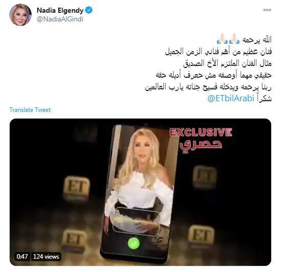 وكتبت نادية الجندي تغريدة على تويتر "الله يرحمه.. فنان عظيم من أهم فناني الزمن الجميل مثال الفنان الملتزم الأخ الصديق حقيقي مهما أوصفه مش حعرف أديله حقه.. ربنا يرحمه ويدخله فسيح جناته يارب العالمين شكراً"
