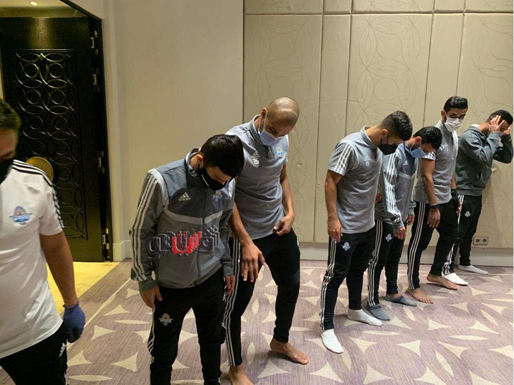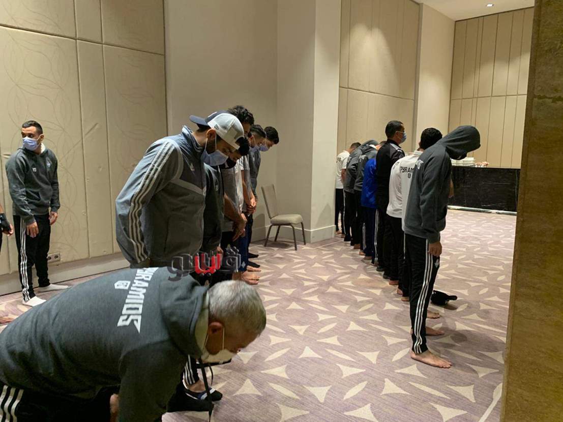 أدت بعثة فريق الكرة بنادي بيراميدز، صلاة الجمعة، اليوم، بإحدى القاعات الخاصة بفندق الإقامة في مدينة كازبلانكا المغربية.