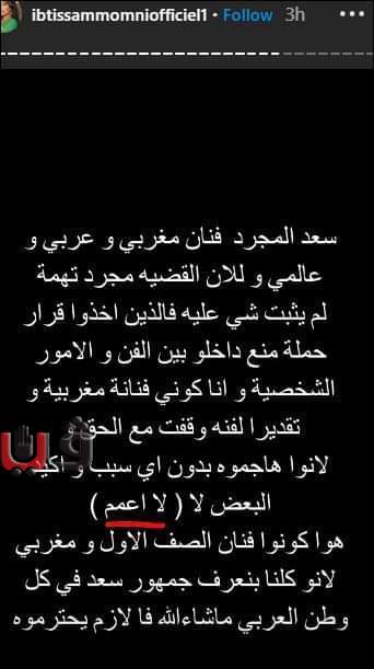 وتابعت قائلة: "سعد لمجرد فنان مغربى وعربى وعالمى وللأن القضية مجرد تهم لم يثبت شيء عليه فالذين أخذوا قرار حملة منع داخ لو الفن والأمور الشخصية وأنا كونى فنانة مغربية وتقديرا لفنه وقفت مع الحق لأنهم هاجموه بدون أي سبب وأكيد البعض لا " لا أعمم"، هو كونوا فنان الصف الأول والمغرب لأنه كلنا بنعرف جمهور سعد في كل الوطن العربى ما شاء الله فلازم يحترموه".