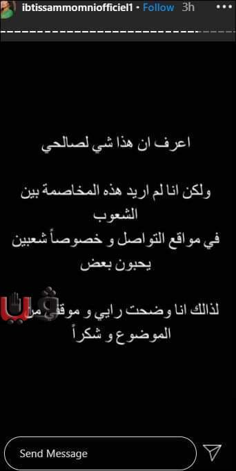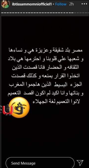 في هذا السياق قالت ملكة جمال المغرب عبر ستورى حسابها بموقع إنستجرام: "مصر بلد شقيقة وعزيزة هي ونساءها وشعبها على قلوبنا واحترمها هي بلاد الثقافة والحضارة فإن قصدت الجزء البسيط الذين هاجمو المغرب وبناتها وأنا أكيد لم أكون أقصد التعميم لأن التعميم لغة الجهلاء".