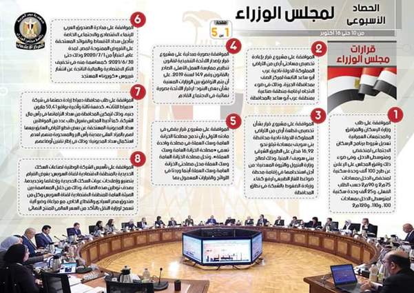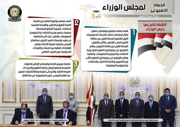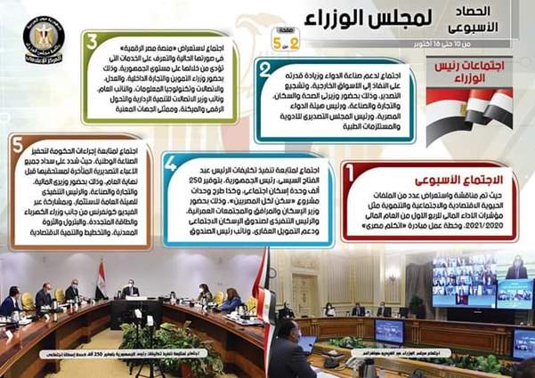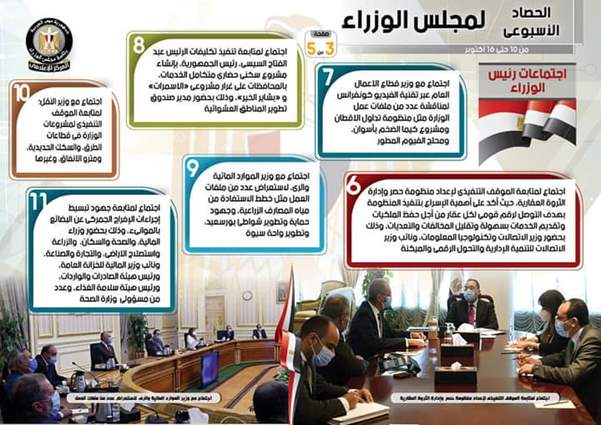 نشر المركز الإعلامي لمجلس الوزراء، تقريراً شمل إنفوجرافات سلط من خلالها الضوء على الحصاد الأسبوعي لمجلس الوزراء، وذلك خلال الفترة من 10 حتى 16 أكتوبر 2020، والذي تضمن الموافقة على عدد من القرارات، فضلاً عن الاجتماعات واللقاءات التي عقدها الدكتور مصطفى مدبولي، رئيس مجلس الوزراء، بالإضافة إلى ما قام به من أنشطة.