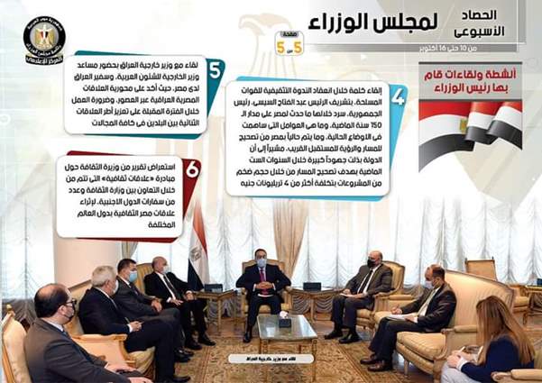 أما بشأن اللقاءات التي عقدها الدكتور مصطفى مدبولي رئيس مجلس الوزراء على مدار الأسبوع، أظهر التقرير لقاء سيادته مع وزير خارجية العراق بحضور مساعد وزير الخارجية للشئون العربية، وسفير العراق لدى مصر، حيث أكد على محورية العلاقات المصرية العراقية عبر العصور، وضرورة العمل خلال الفترة المقبلة على تعزيز أطر العلاقات الثنائية بين البلدين في كافة المجالات.