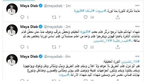 وكتبت مايا دياب تغريدة على تويتر :" #١٧_تشرين الثورة الحقيقية: هي انّو ننزل على الطريق بلا موعد ولا اعلان ونبقى على الطريق ونبدّل ونتكاثر ونقل ونقوى ويواجهونا ونبقى.. يقتلونا ونبقى وتكون المواجهات عنيفة ونوصل على بيوتن ومكاتبن وقصورن وخنادقن ونتورِخ نهايات فسادن..نخسر ناس ونسمّين شهداء اكيد..شهداء الارادة..#بيروت"