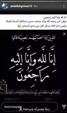 وكتب عبدالله جمعة عبر حسابه الشخصي على انستجرام: " إنا لله وإنا إليه راجعون توفي إلى رحمة الله والد محمد حسن نسالكم الدعاء فضلا وليس آمرا فانه يسال الان بين يدي الرحمن".