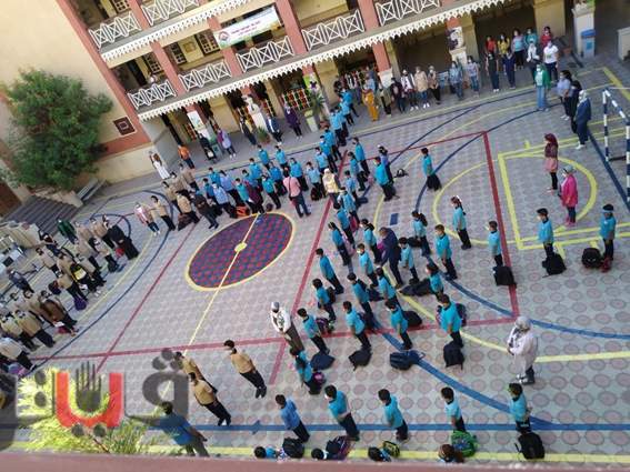 كما قامت المدرسة بتخطيط الفناء وتقسيمه إلى أجزاء، لجعل الطلاب يقفون في أماكن محددة خلال الطابور الصباحي للحفاظ على التباعد الاجتماعي بينهم.