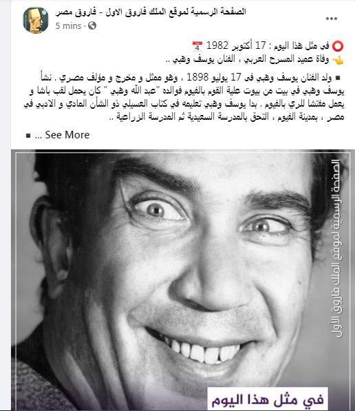 احتفت الصفحة الرسمية للملك فاروق بذكرى وفاة عميد المسرح العربي الفنان الراحل يوسف وهبي، الذي توفى في يوم 17 أكتوبر 1982، بعد دخوله مستشفى المقاولون العرب اثر اصابته بكسر في عظام الحوض، حيث وافته المنيه أثناء العلاج بسكتة قلبية مفاجئة عقب حياة مليئة بالابداع والفن.