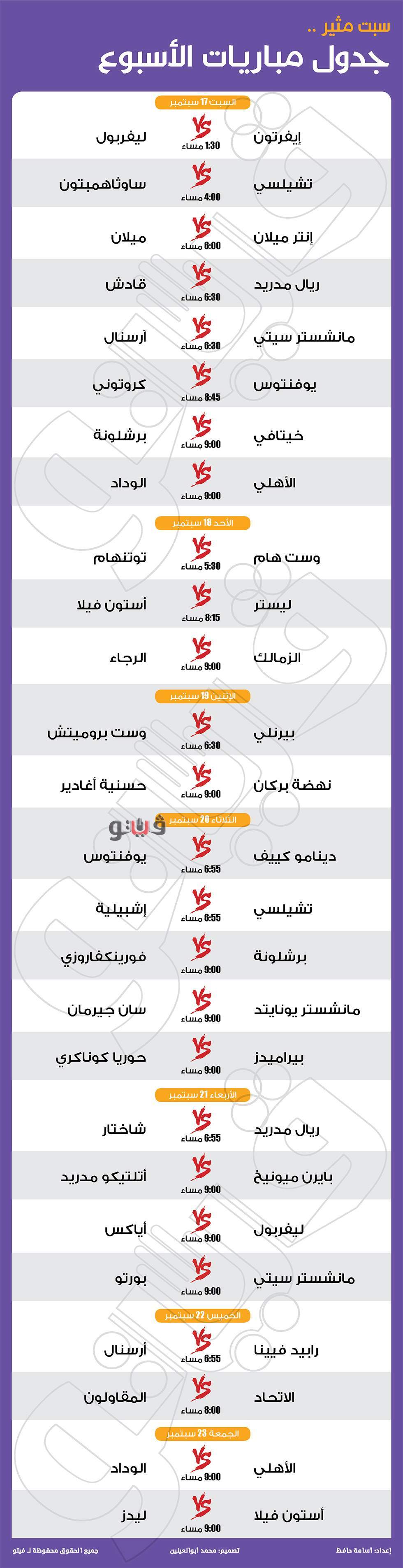 سبت مثير .. جدول مباريات الأسبوع.. إنفوجراف السبت 17/أكتوبر/2020 - 12:19 م 10/17/2020 12:19:06 PM سبت مثير .. جدول مباريات الأسبوع شارك طباعة 18 حجم الخط شارك طباعة الزمالك الأهلي الرجاء الوداد