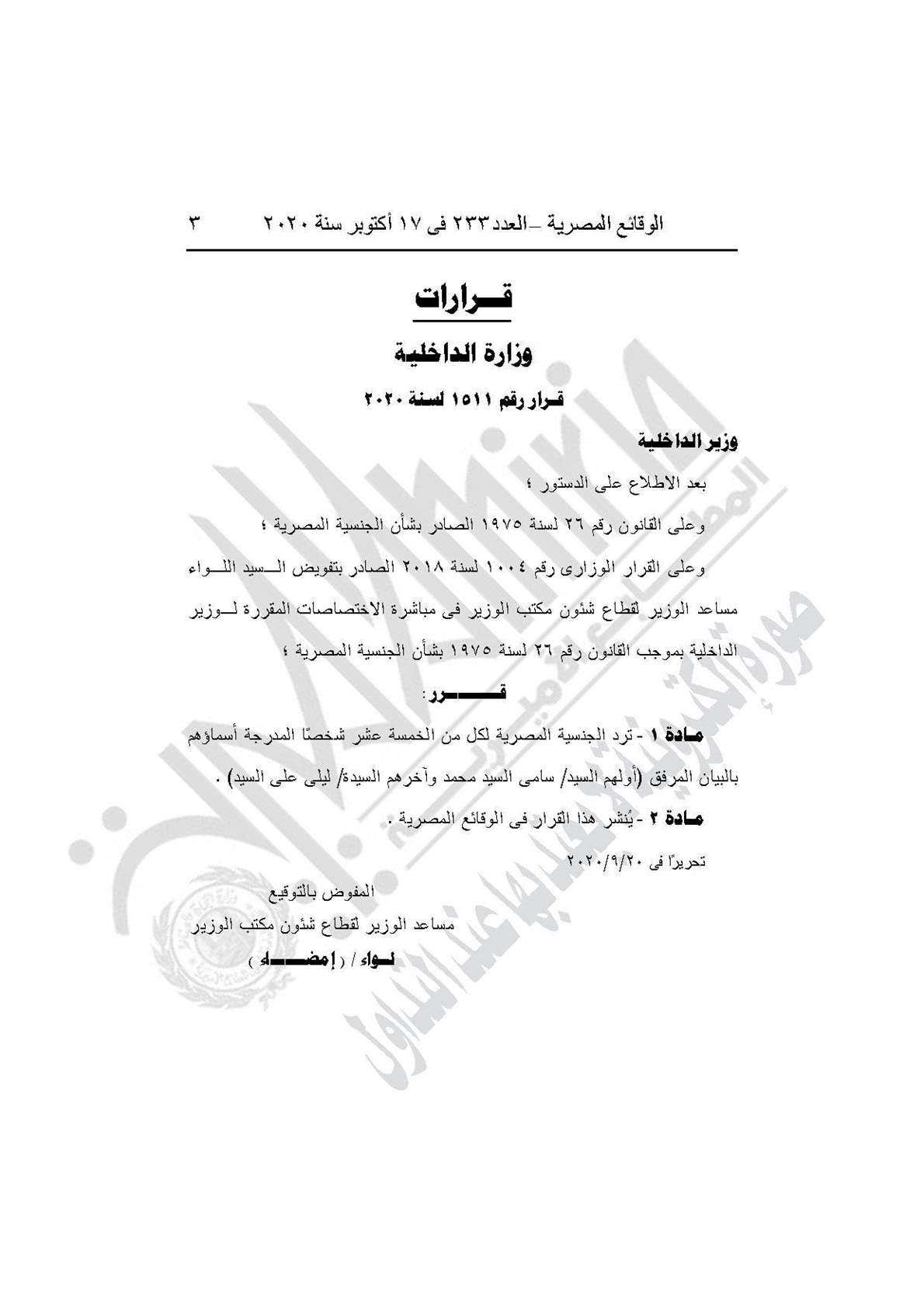 - القرار رقم 1511 لسنة 2020، برد الجنسية المصرية لكل من الـ15 شخصًا المدرجة أسماؤهم بالبيان (أولهم سامي السيد محمد وآخرهم ليلى علي السيد).