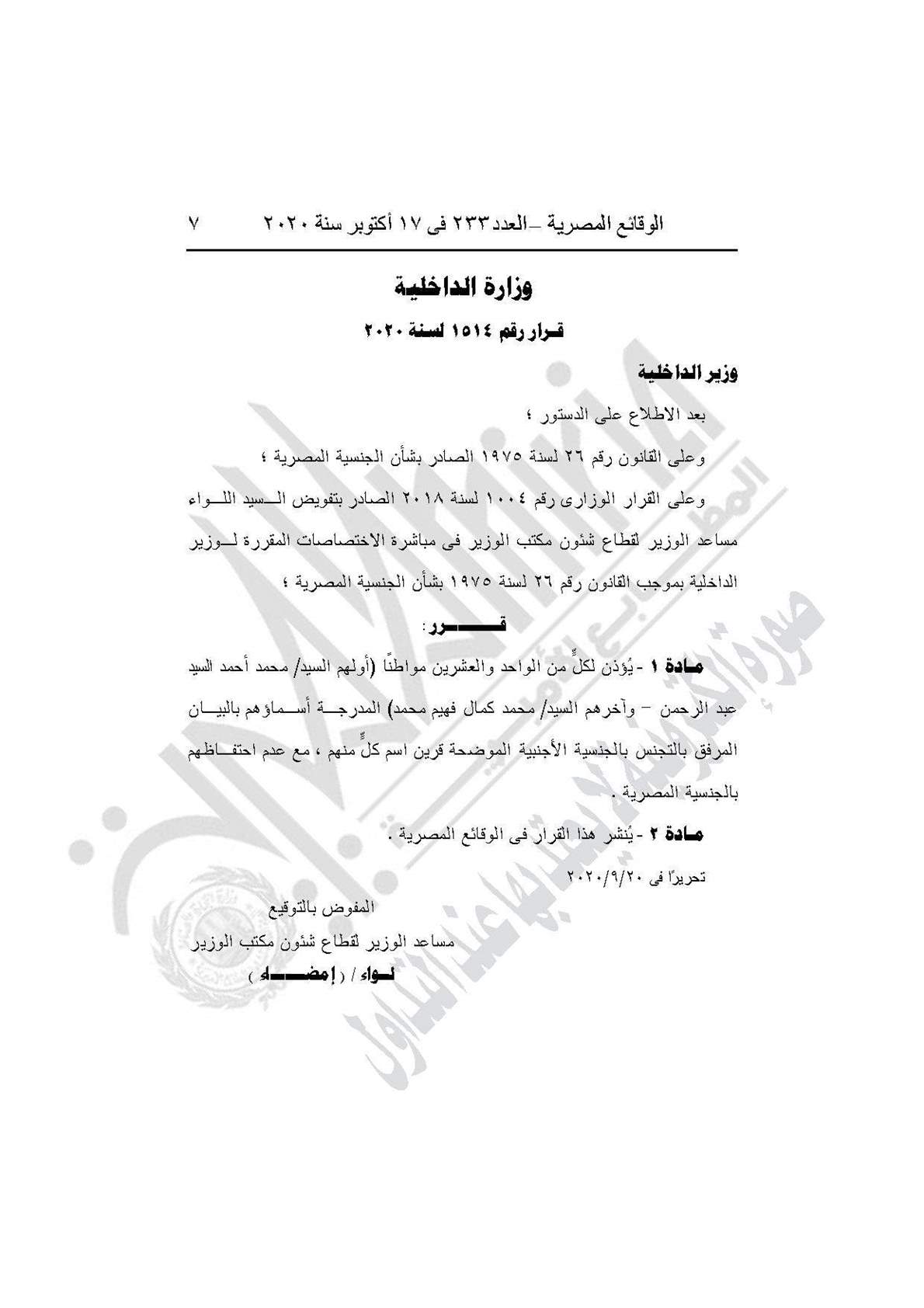 - القرار رقم 1514 لسنة 2020، بالأذن لكل من الـ21 مواطنًا (أولهم محمد أحمد السيد عبد الرحمن، وآخرهم محمد كمال فهيم محمد) بالتجنس بالتجنس بالجنسية الأجنبية قرين اسم كل منهم، مع عدم احتفاظهم بالجنسية المصرية.