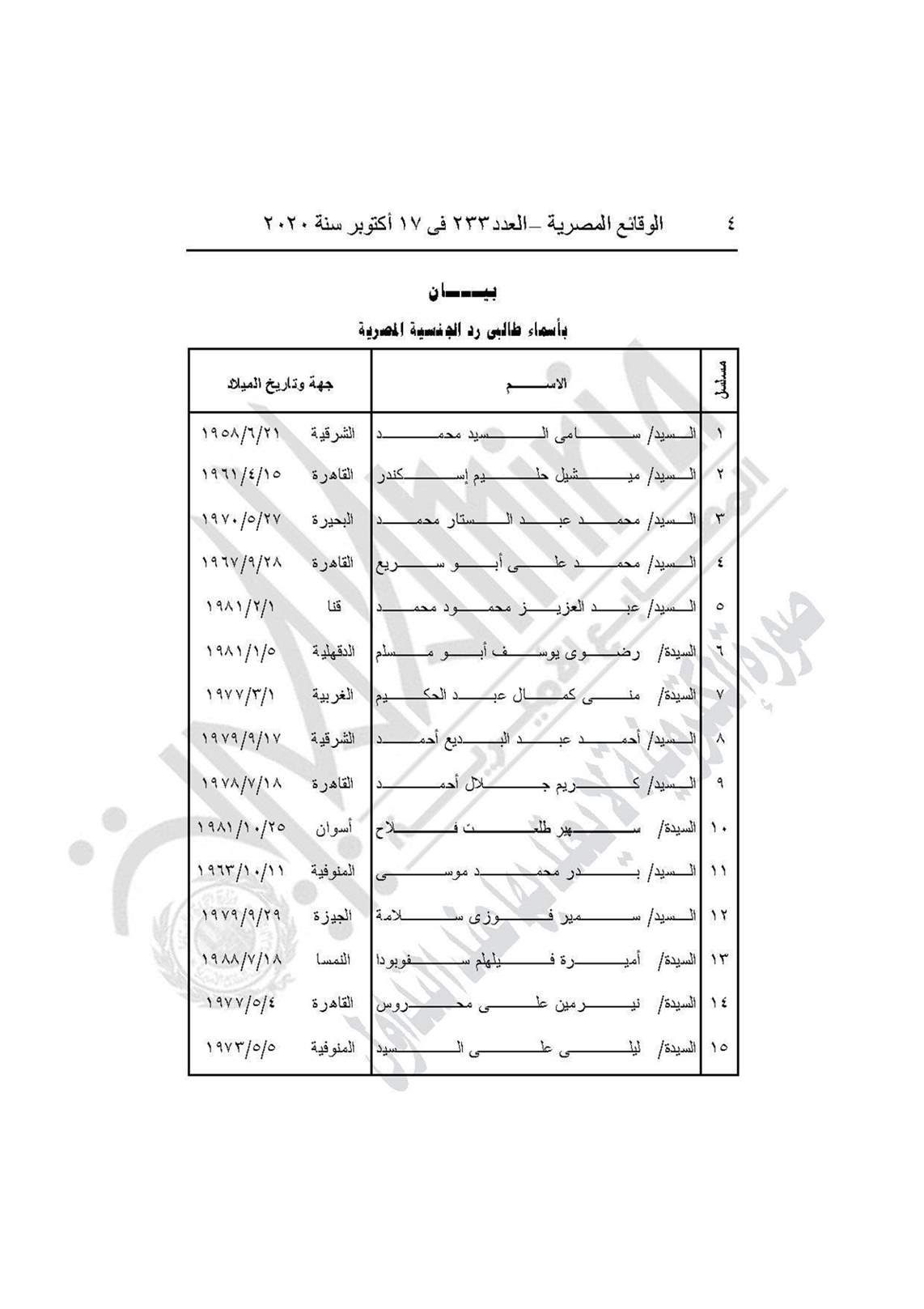 نشرت جريدة الوقائع المصرية في عددها رقم 233، الصادر في 17 أكتوبر 2020، 3 قرارات لوزارة الدخلية برد الجنسية المصرية لـ15 شخطًا، وسحب الجنسية المصرية من 44 مواطنًا.