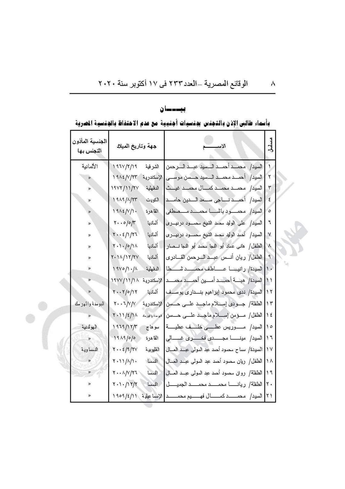- القرار رقم 1513 لسنة 2020، بالأذن لكل من الـ23 مواطنًا (أولهم إسلام سيد حنفي حسن وآخرهم طارق أحمد محمد بكير) بالتجنس بالجنسية الجنبية قرين اسم كل منهم، مع عدم احتفاظهم بالجنسية المصرية.