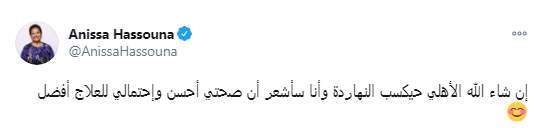 وكتبت أنيسة حسونة تغريدة على تويتر "إن شاء الله الأهلي حيكسب النهاردة وأنا سأشعر أن صحتي أحسن وإحتمالي للعلاج أفضل"