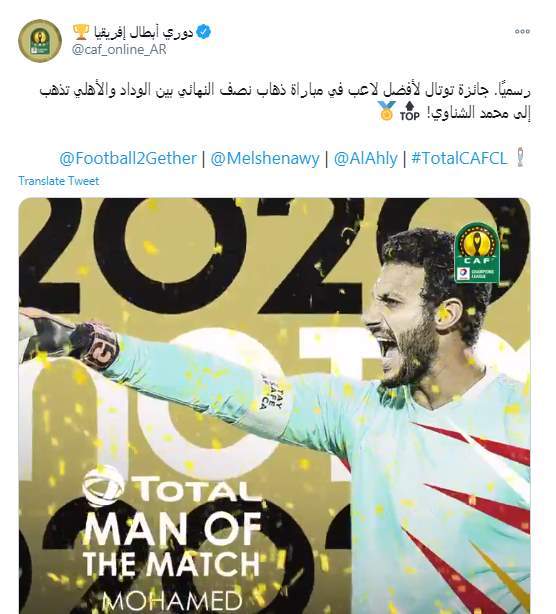 وكتب الحساب الرسمية لدوري أبطال إفريقيا تغريدة على تويتر: "رسميًا.. جائزة توتال لأفضل لاعب في مباراة ذهاب نصف النهائي بين الوداد والأهلي تذهب إلى محمد الشناوي!".