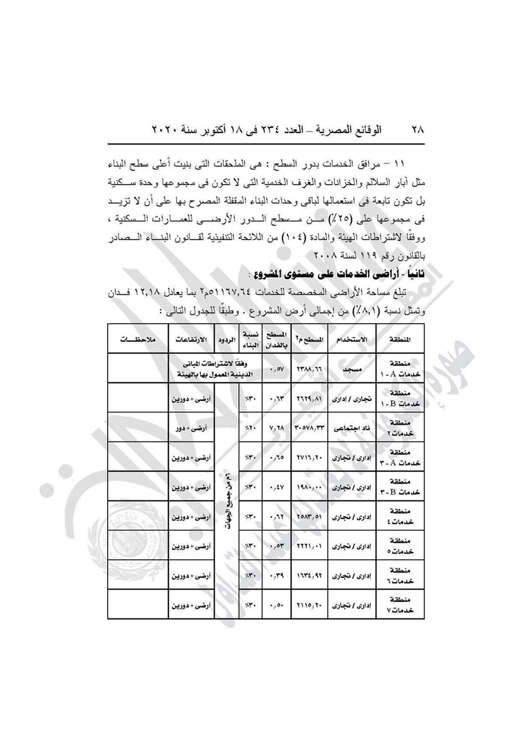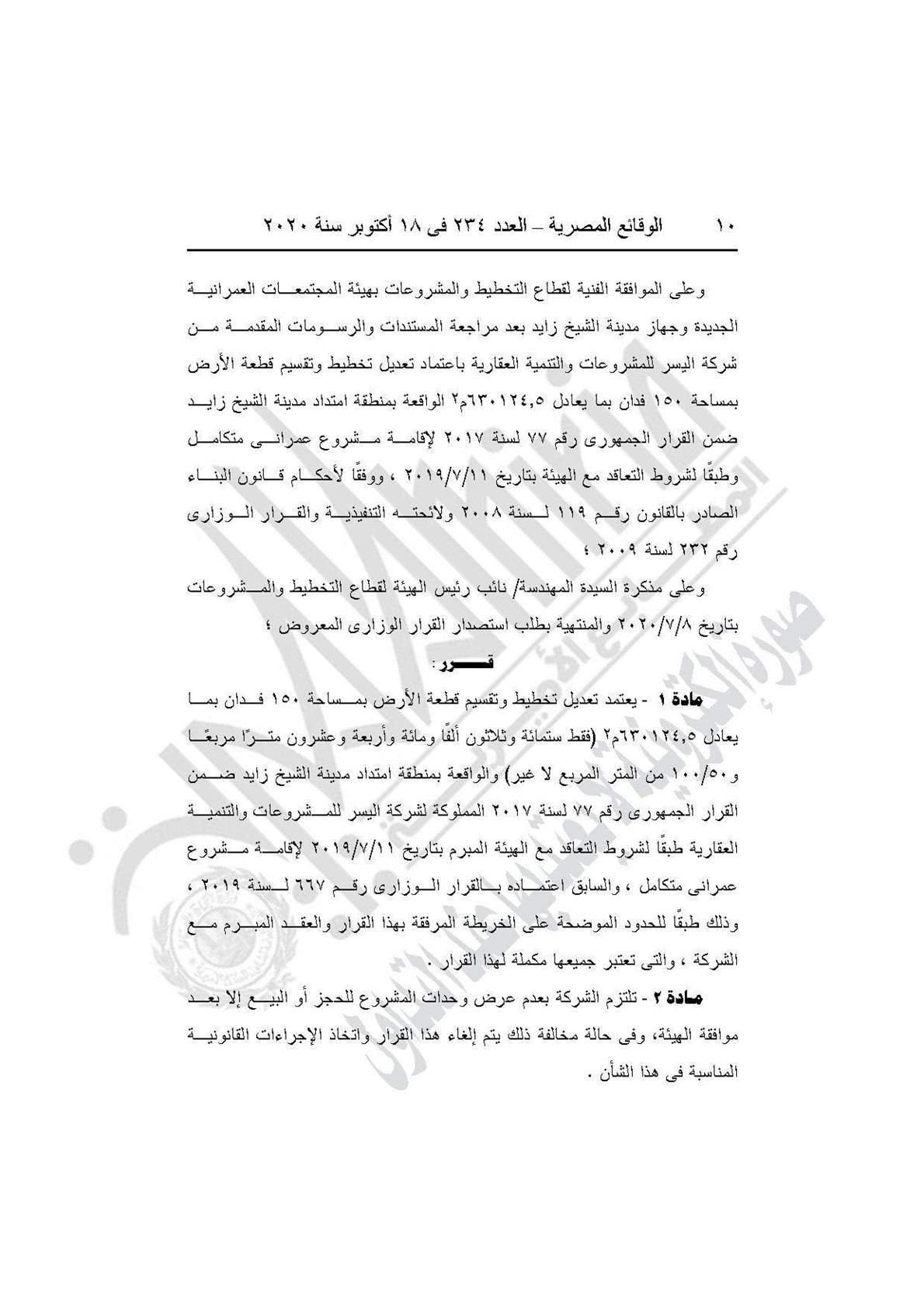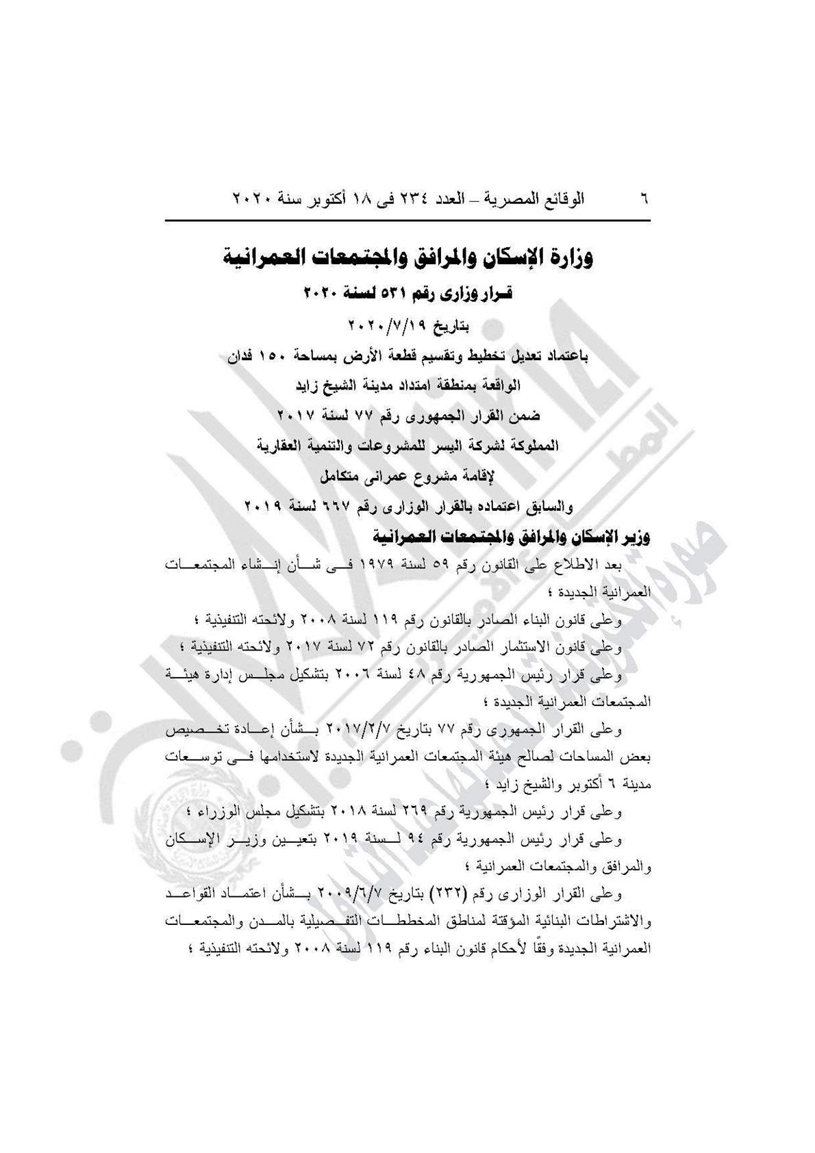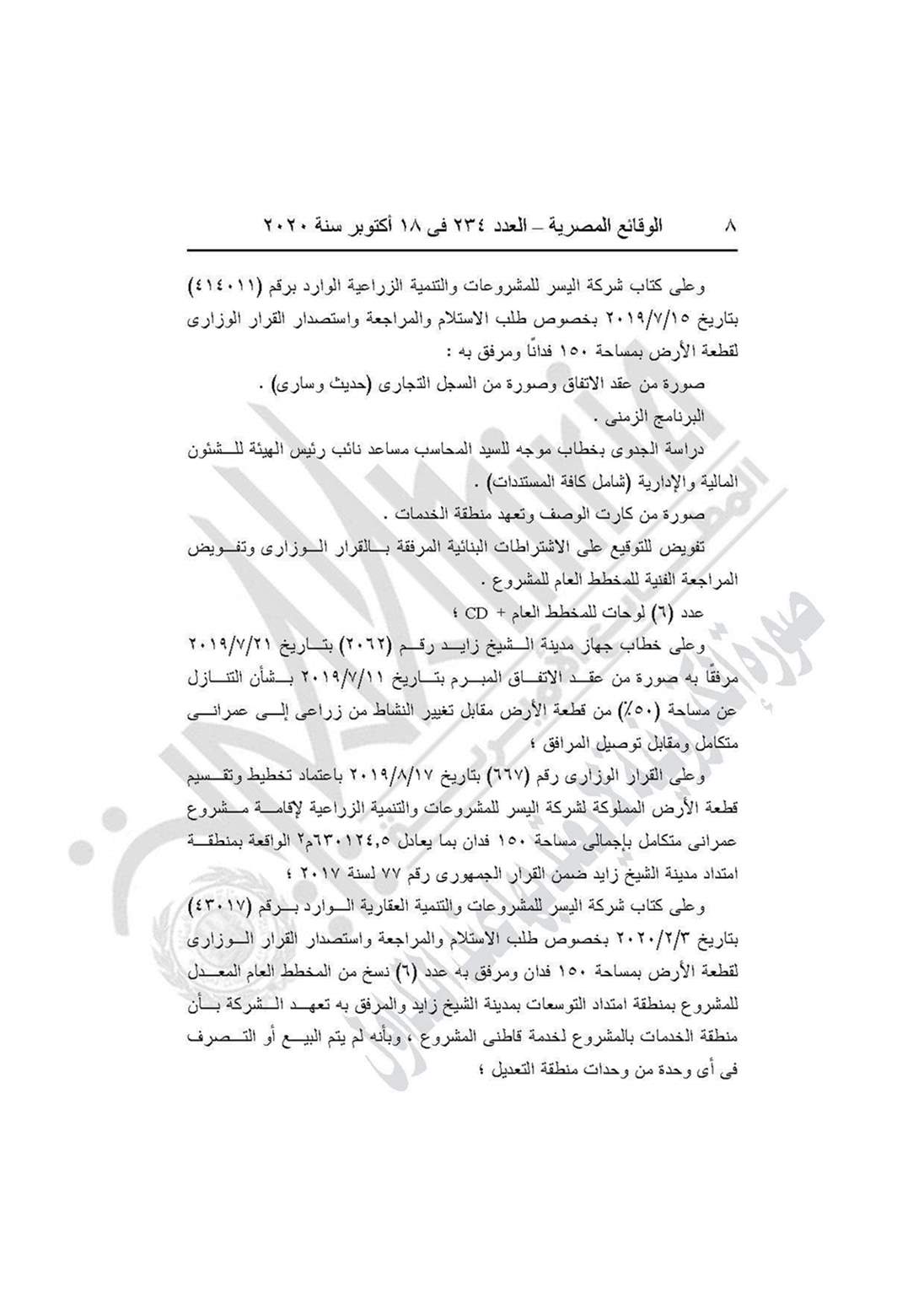 نشرت جريدة الوقائع المصرية في عددها رقم 234، الصادر في 18 أكتوبر 2020، قرار وزارة الإسكان والمرافق والمجتمعات العمرانية رقم 531 لسنة 2020، بشأن اعتماد تعديل تخطيط وتقسيم قطعة الأرض بمساحة 150 فدانا الواقعة بمنطقة امتداد مدينة الشيخ زايد لإقامة مشروع عمراني متكامل.