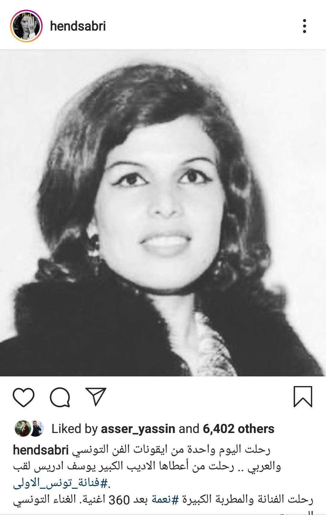 نعت الفنانة التونسية هند صبري عبر حسابها الشخصي على موقع الصور الشهير "انستجرام"، المطربة التونسية الراحلة نعمة، والتي وافتها المنية اليوم الأحد عن عمر ناهز 86 عاما.