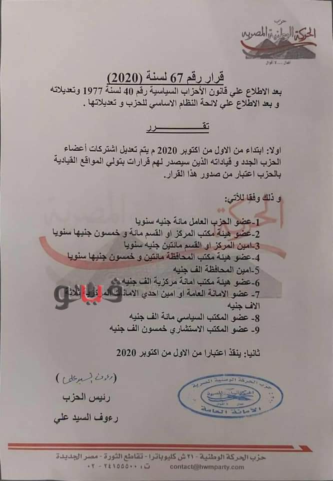 قرر حزب الحركة الوطنية المصرية برئاسة اللواء رؤوف السيد ووفقا للائحة الحزب الداخلية ابتداء من الأول من أكتوبر 2020 م يتم تعديل اشتراكات أعضاء الحزب الجدد والقيادات الذين ستصدر لهم قرارات بتولي المواقع القيادية بالحزب ابتداء من صدور هذا القرار.