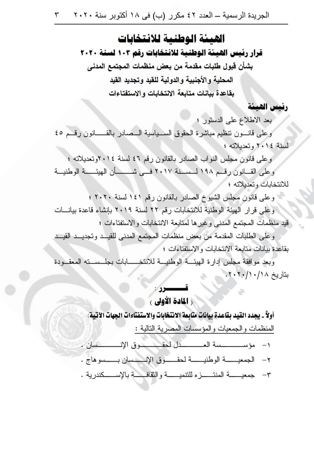 نشرت الجريدة الرسمية في عددها رقم 42 مكرر "ب"، والصادر في 18 أكتوبر 2020، قرار رئيس الهيئة الوطنية للانتخابات رقم 103 لعام 2020.
