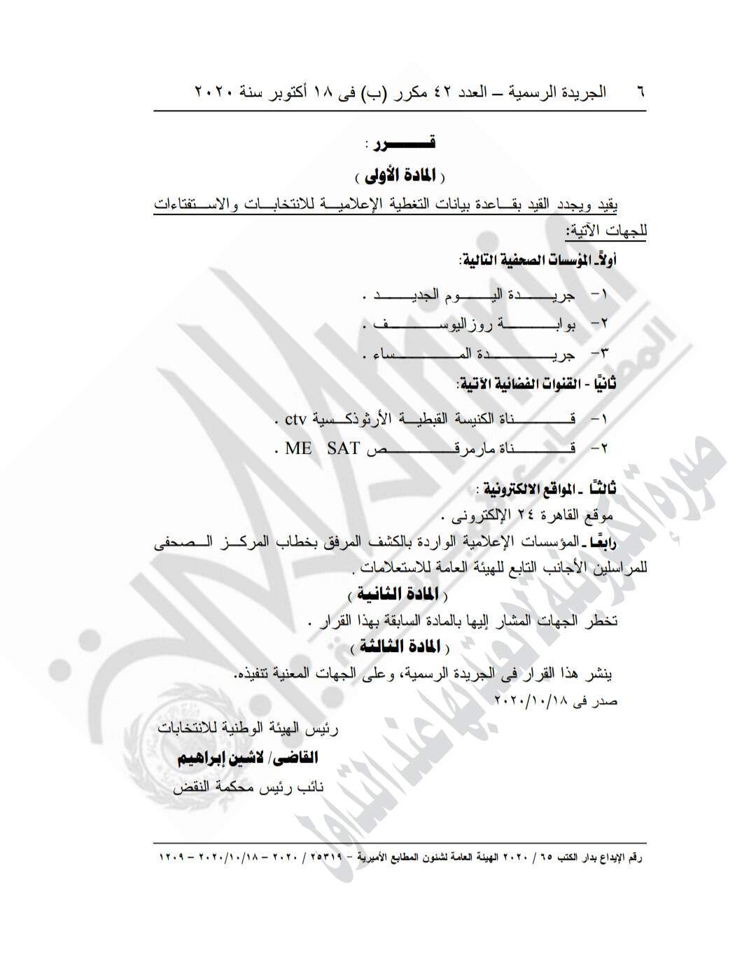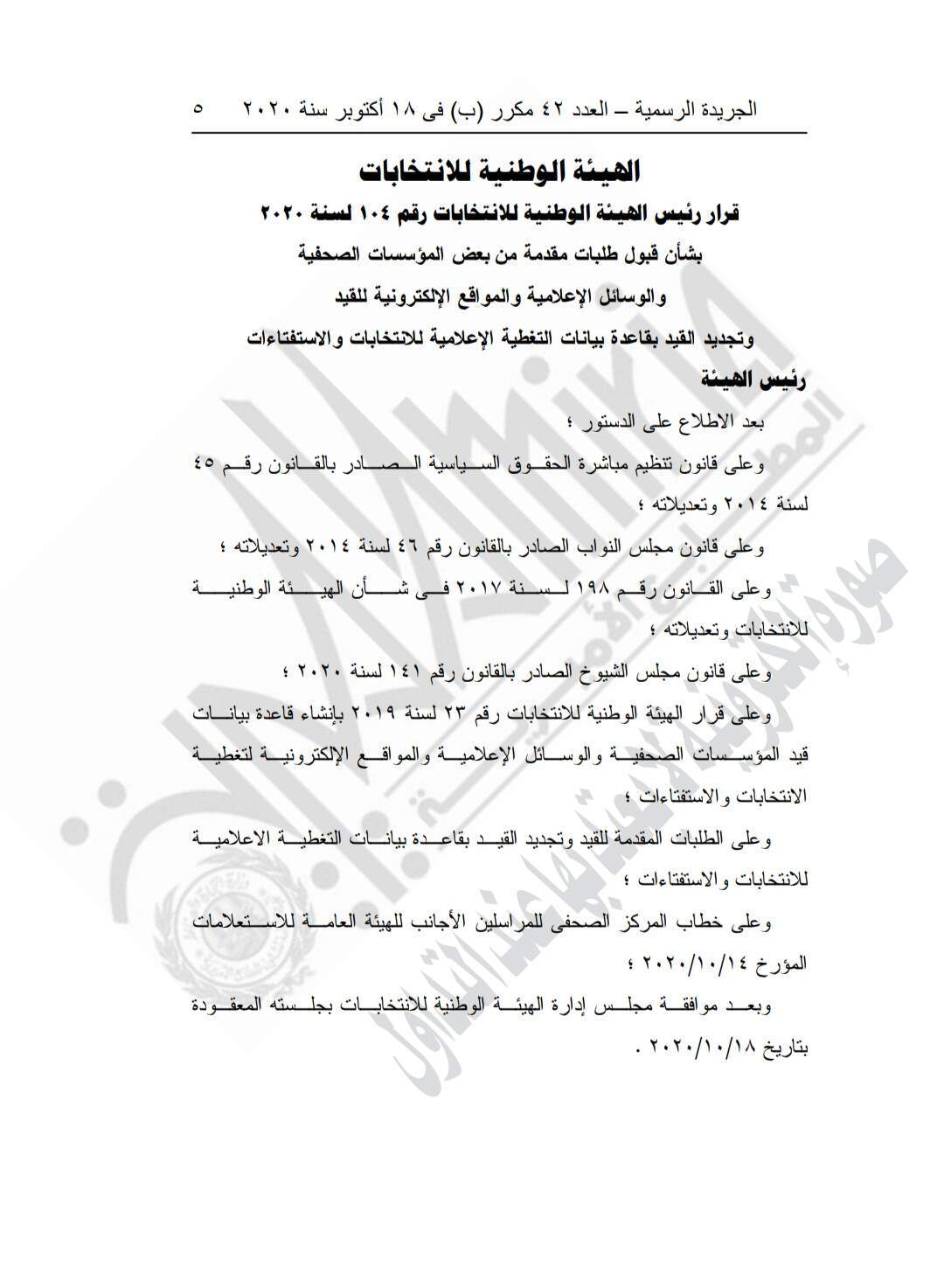 نشرت الجريدة الرسمية في عددها رقم 42 مكرر "ب"، والصادر في 18 أكتوبر 2020، قرار رئيس الهيئة الوطنية للانتخابات رقم 104 لعام 2020.