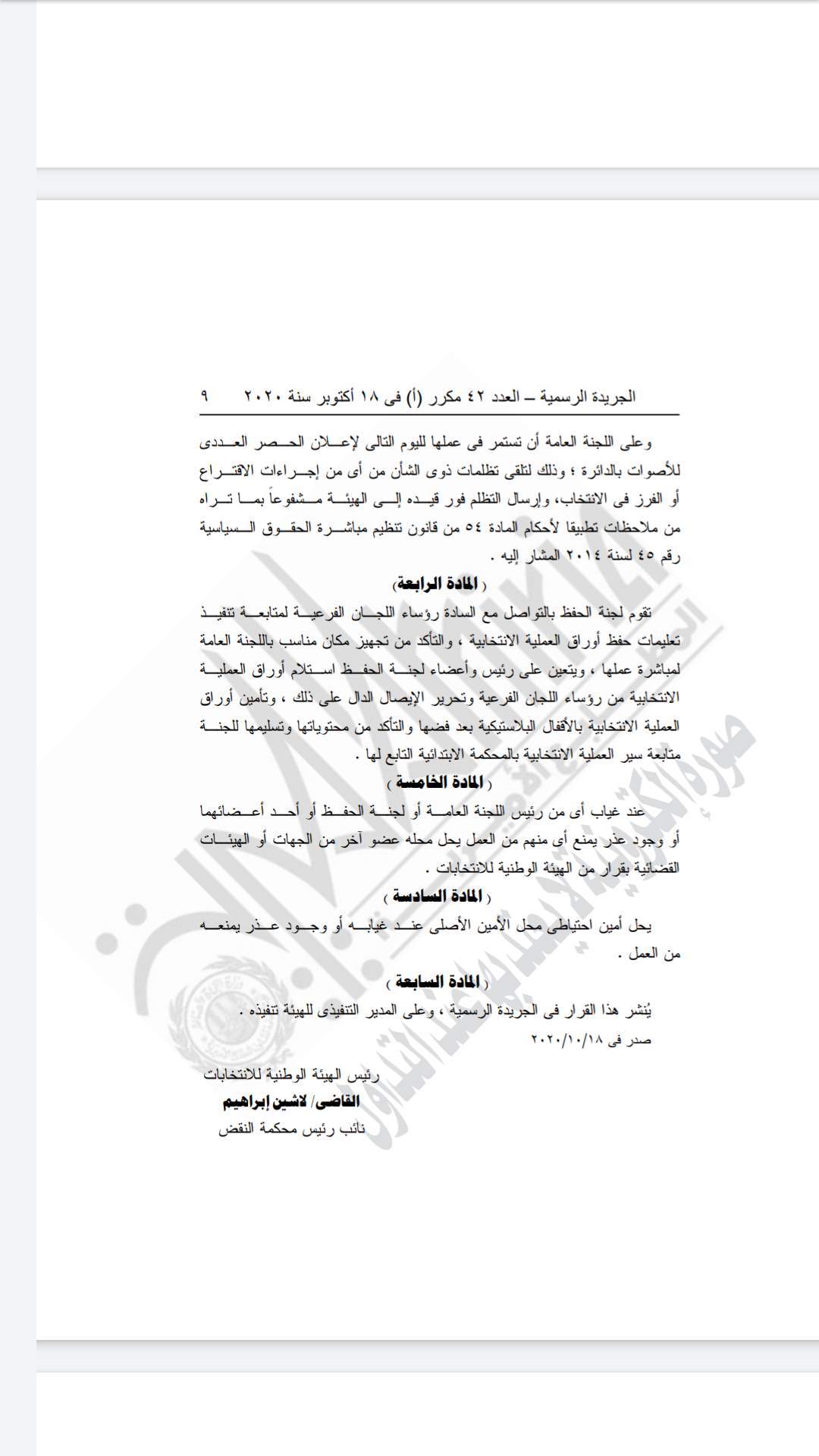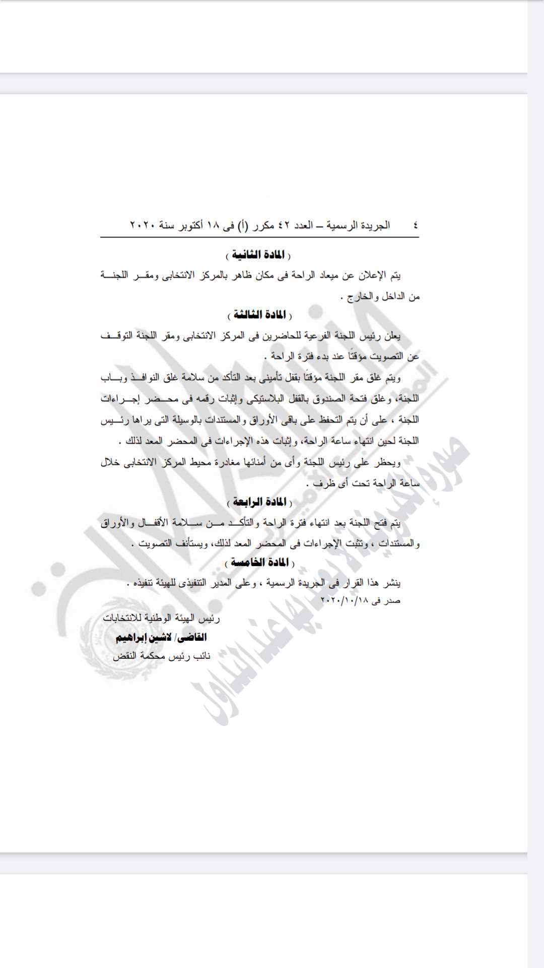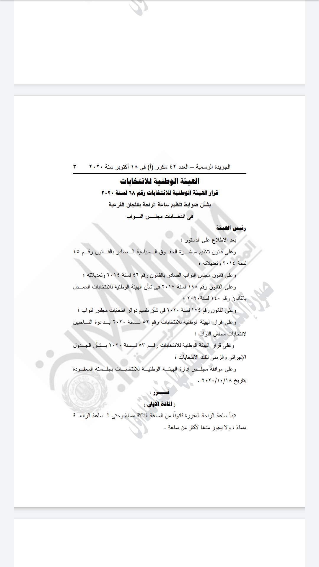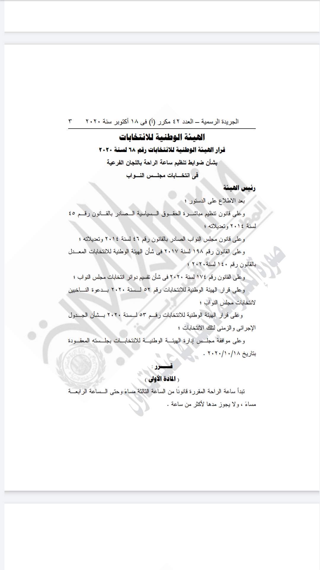 نشرت الجريدة الرسمية في عددها رقم 42 مكرر "أ"، والصادر في 18 أكتوبر 2020، قرار رئيس الهيئة الوطنية للانتخابات رقم 68 لعام 2020، والمتعلق بضوابط تنظيم ساعة الراحة باللجان الفرعية في انتخابات مجلس النواب.