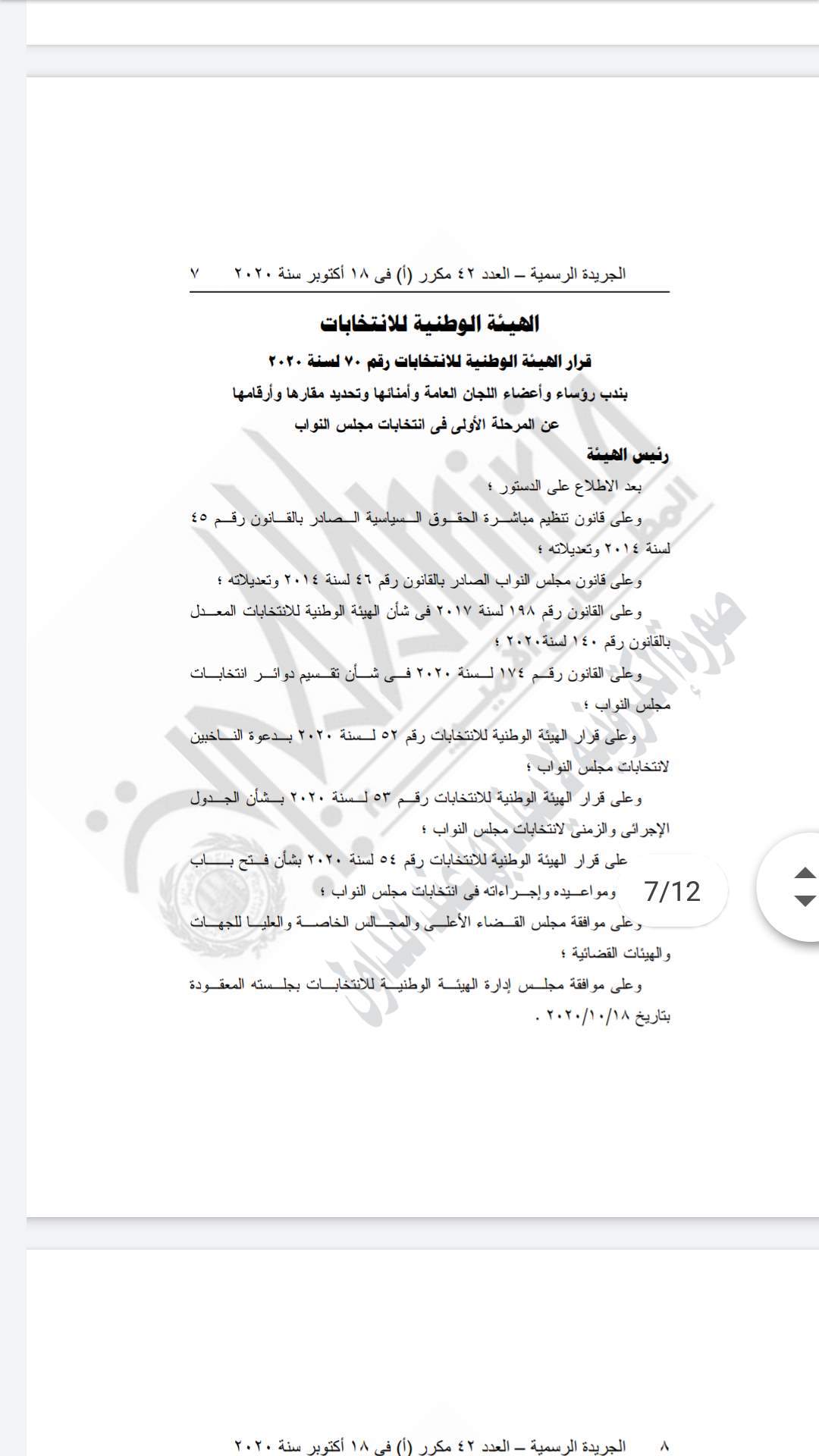 وقرار رقم 70 لسنة 2020، والمتعلق بندب رؤساء وأعضاء اللجان العامة وأمنائها وتحديد مقارها وأرقامها عن المرحلة الأولى في انتخابات مجلس النواب.