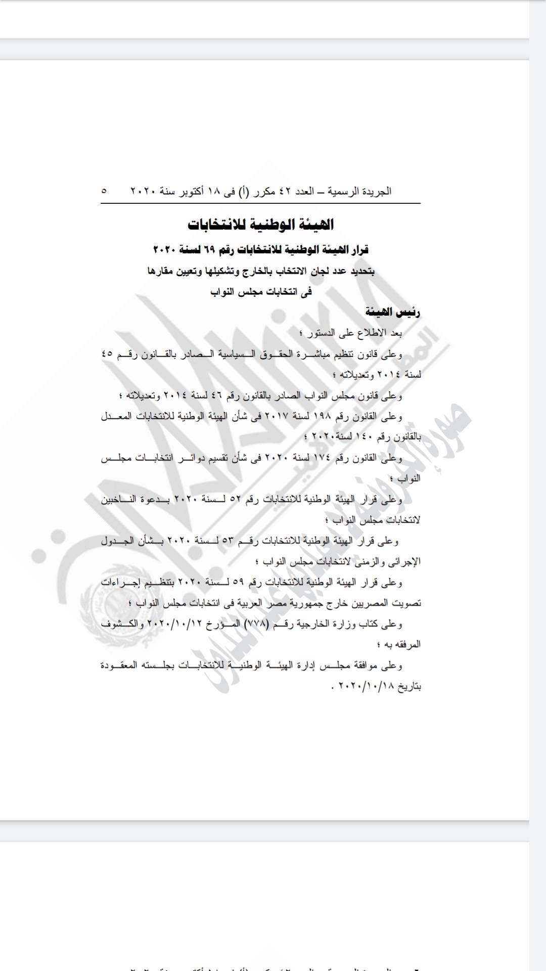 بالإضافة إلى قرار رقم 69 لسنة 2020، و الخاص بتحديد عدد لجان الانتخاب بالخارج وتشكيلها وتعيين مقارها في انتخابات مجلس النواب.