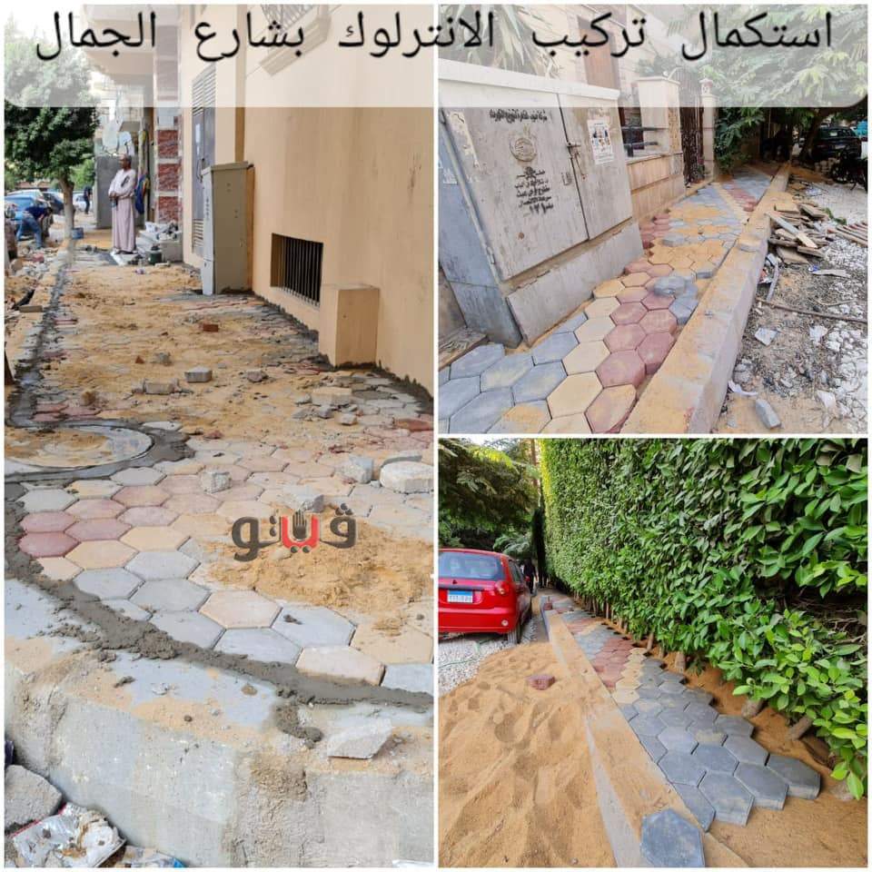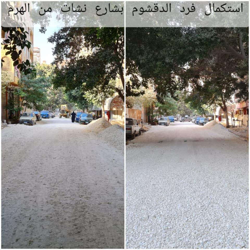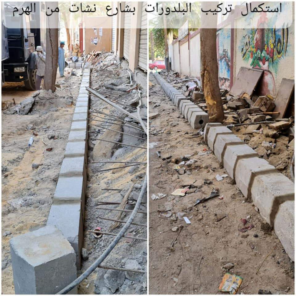 كما تم تركيب بلاط الإنترلوك بشارع الجمال من شارع بسام الشريف تمهيدا لرصف الشارع ومواصلة فرد طبقه الدقشوم وتركيب البلدورات الخرسانية بشارع نشأت من شارع الهرم تمهيدا لرصف الشارع.