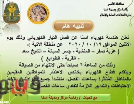 وأوضحت هندسة كهرباء إسنا أن قطع التيار يبدأ في الساعة السادسة صباحًا ويستمر حتى الانتهاء من أعمال الصيانة.