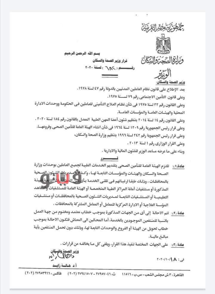 أصدرت الدكتورة هالة زايد وزيرة الصحة القرار رقم 682 لسنة 2020 ، بشأن علاج جميع أعضاء الفريق الطبي والعاملين بوزارة الصحة.