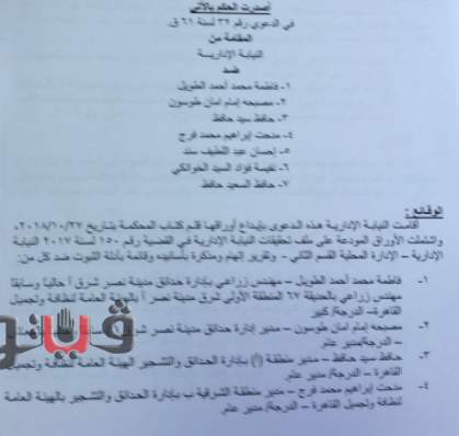 وقضت ببراءة فاطمة محمد أحمد، مهندسة زراعية بإدارة حدائق شرق مدينة نصر لعدم إهمالها في الحفاظ على التنسيق العام للحديقة 67 بشرق مدينة نصر، وأتخذت بالإشتراك مع الثانية الإجراءات اللازمة حيال التلفيات التي أحدثتها شركة اليرموك بالحديقة، وقامت بإعداد مقايسة بحجم تلك التلفيات