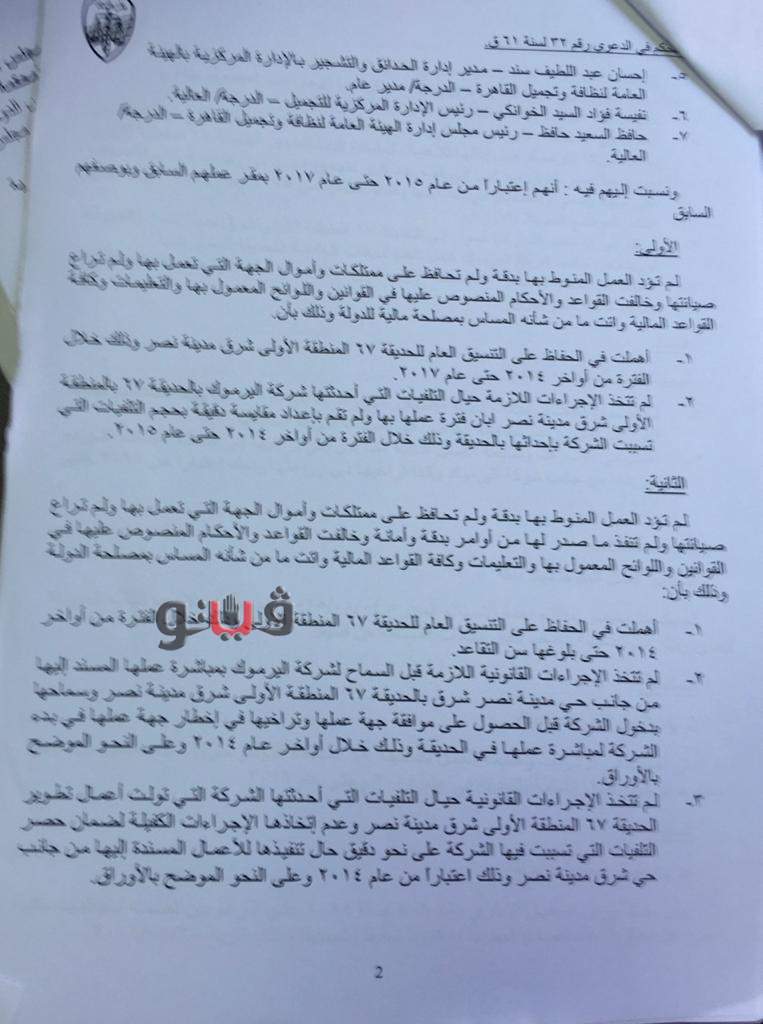 وأنتهت المحكمة إلى براءة نفيسة فؤاد السيد، رئيس الإدارة المركزية للتجميل بالهيئة بعد ثبوت عدم إهمالها في الإشراف ومتابعة العمل بالحديقة 67 الكائنة بشرق مدينة نصر لمدة عامين