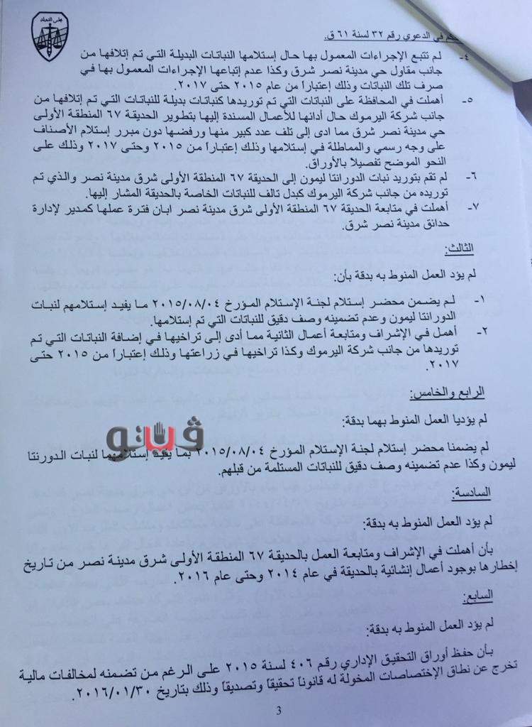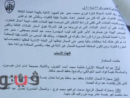 وقضت المحكمة بخصم أجر 15 يومًا من راتب حافظ سيد حافظ، مدير المنطقة (أ) بإدارة الحدائق والتشجير بالهيئة العامة للنظافة والتجميل بالقاهرة لعدم قيامه بتضمين محضر الإستلام مما يفيد إستلام نبات الدورانتاليمون أو تضمينه وصف دقيق للنباتات التي تم إستلامها، وأهمل في الإشراف ومتابعة أعمال المحالة الثانية مما أدى إلى تراخيها في إضافة النباتات الموردة من جانب شركة اليرموك، وكذا تراخيها في زراعتها لمدة عامين