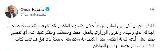 وكتب عمر الرزاز تغريدة على تويتر "الشكر الجزيل لكل من راسلني مودعاً خلال الاسبوع الماضي فقد تشرفت بثقة سيدي صاحب الجلالة الذي وجهني والفريق الوزاري بالعمل معكم وخدمتكم، وحقكم علينا على أي تقصير صدر منا.