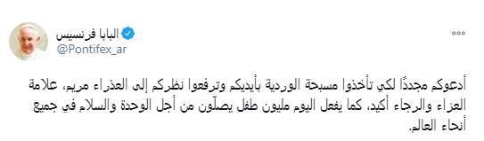 وكتب البابا فرنسيس تغريدة على تويتر "أدعوكم مجددًا لكي تأخذوا مسبحة الوردية بأيديكم وترفعوا نظركم إلى العذراء مريم، علامة العزاء والرجاء أكيد، كما يفعل اليوم مليون طفل يصلّون من أجل الوحدة والسلام في جميع أنحاء العالم"