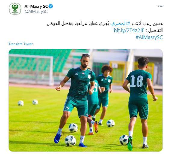 وكتب نادي المصري تغريدة على تويتر "حسين رجب لاعب #المصري يُجري عملية جراحية بمفصل الحوض"